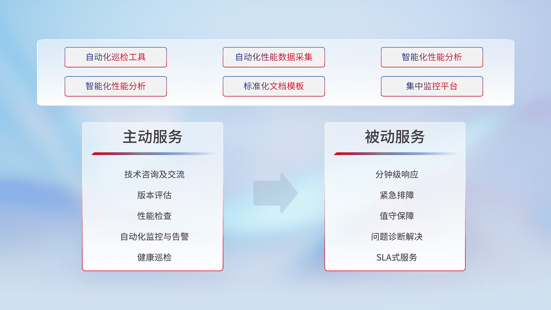 智能化工具和标准化文档,,保障服务质量,,提供主动服务(包含技术咨询、、、版本评估、、性能检查、、、自动化监控与告警、、、、健康巡检)和被动服务包含(分钟级响应、、紧急排障、、值守保障、、问题诊断解决、、SLA服务)。。。